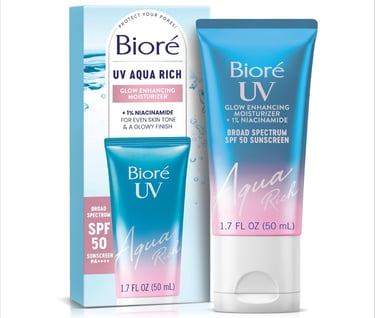 conclusion: The Bioré UV Aqua Rich Glow Enhancing Moisturizer SPF 50 is a lightweight, multifunctional sunscreen that blends high-level sun protection with skincare and cosmetic benefits. Its Japanese gel encapsulation technology delivers weightless SPF 50 coverage, while hyaluronic acid and 1% niacinamide hydrate and refine skin texture. Light-reflecting micas add a natural, sun-kissed glow without shimmer or white cast, making it ideal for all skin tones and types—including sensitive skin. Praised for its silky, non-greasy feel and radiant finish, it doubles as a moisturizer, sunscreen, and makeup primer. However, it’s not water-resistant and requires regular reapplication during sun exposure.