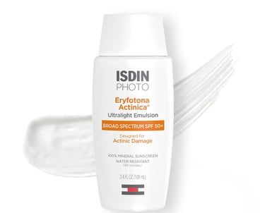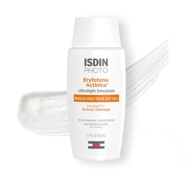 ISDIN Eryfotona Actinica Mineral Sunscreen offers broad-spectrum UVA/UVB SPF 50+ protection in an ultra-light, fast-absorbing formula that feels comfortable on the skin.